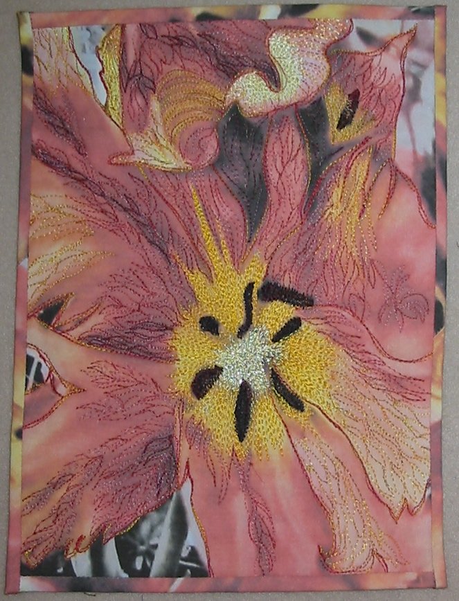 | Design Source - Description | Photo of a parrot tulip in my garden, manipulated on Photoshop and printed onto cotton. Machine quilted. This will be going to the Little Gems project for a tombola at the Festival of Quilts in August |