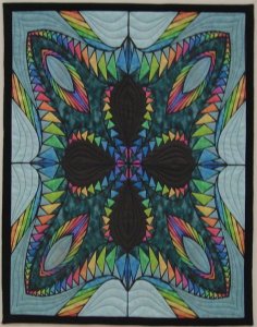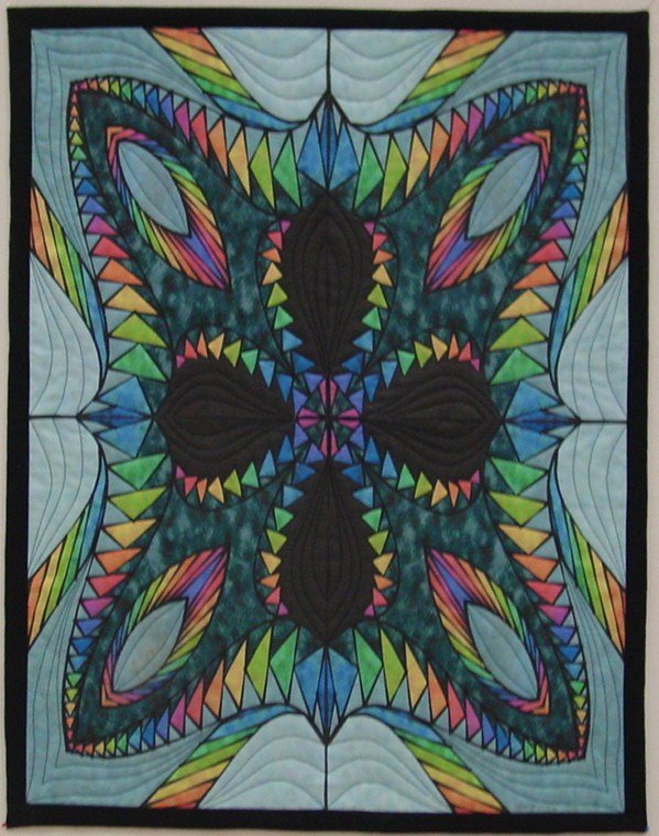 bettyannseeman "Wild Ride" - This quilt was designed in Corel Draw and the fabric printed on my home printer. I used Ricky Tims basic Rhapsody design technique and gave it a Betty spin. I designed piecable areas within the design. One quarter of the design was then painted in Corel Photo Paint. Media line effects were added to the line drawing and the two combined. Four quarters printed and then quilted.
