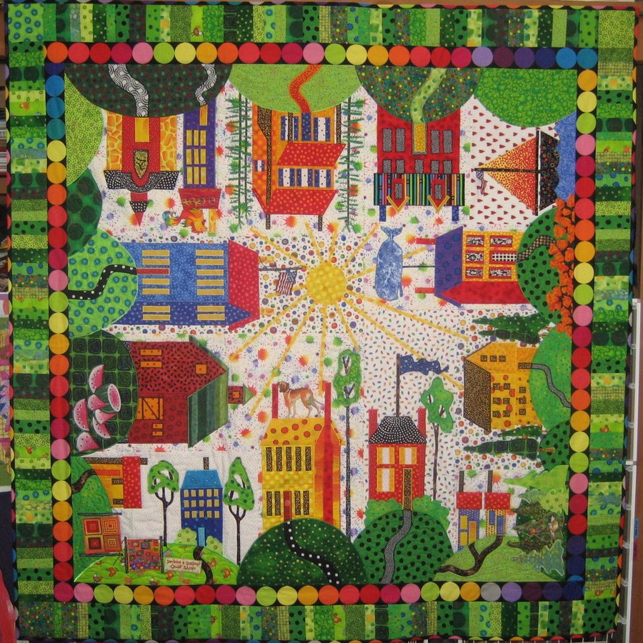 MissLani Pedestrian Friendly - This was made as a Block of the Month for a local quilt shop. Everyone was given an assortment of browns and greens to complete quilt. I chose instead to use bright dots !!!