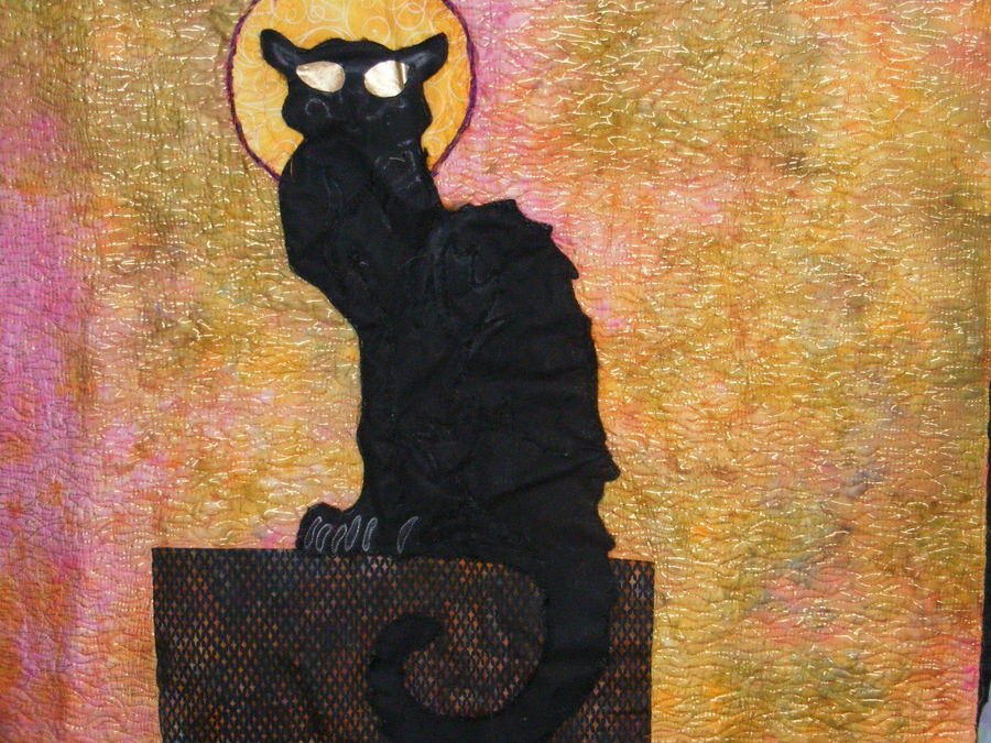 Spiderwebquilter Boston Blackie - One of my three cats was "found" in my trash can looking for food.. He was very skinny, almost starved. Well, two months in the garage, to get fattened up and away from my other cats, a trip to the vets to be vaccinated and nuetered, he is now my biggest baby. There is not one white hair on him and unless he looks right at you in the dark you cannot see him.. this is the most loving cat, loves to go for a ride in the car.. (I just open the door and he comes running to go along),does not get out until I tell him it is okay. He never gets on anything but his beds or "his" chair and has to sit near me all the time.. I love this cat,so HAD to make a quilt of him.