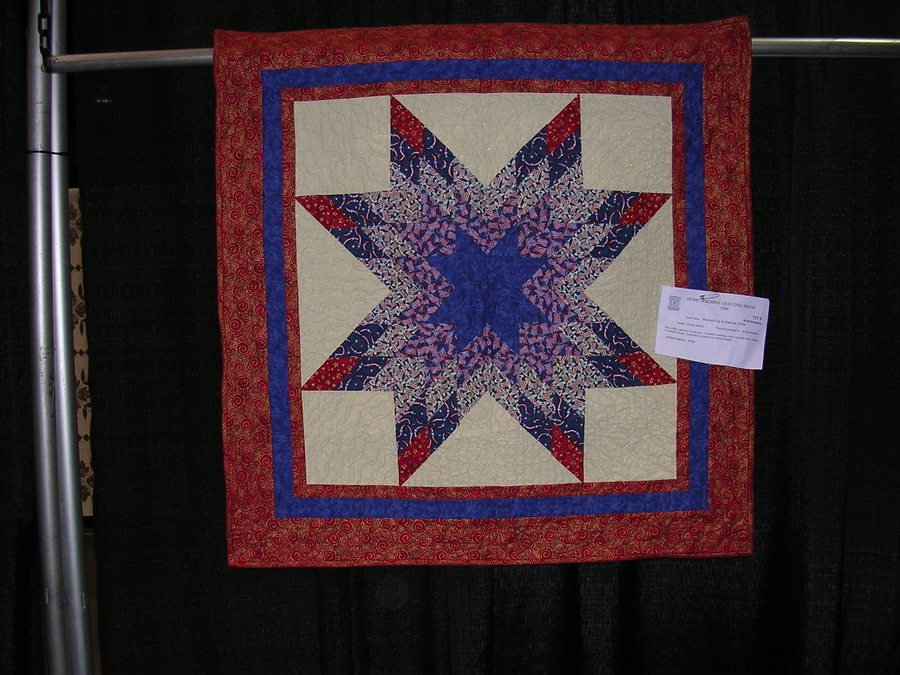 | Design Source - Description | Red, white and blue "Texas Star" type pattern, machine quilted on APQS Millennium with Superior Threads gold metallic, Bottom Line. Hangs in my breezeway during our patriotic holidays. |