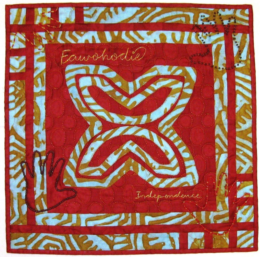 BrendaF Helping Hands Challenge "Independence" - When I first read about this challenge, I was so touched that I could help in a very small way by purchasing the required fabric for the Helping Hands Challenge. When the fabric arrived, I was impressed by the gorgeous texture and color and the personal information I received about the fabric maker. Deciding to use only the challenge fabrics and keeping with an African theme, I chose to use an African Adinka symbol, “Fawohodie” which is a symbol for “independence”. The Fabric for Life Program has tremendously helped these women to better their lives by creating a way for independency. I didn’t want to forget this so I created this image in this small quilt. I also would like to give thanks to Sylvia Davis who recently presented a trunk show about African Quilts at my local Guild meeting which included explaining the Adinka symbols. I didn't make the deadline for the Challenge, but wanted to post it anyway....