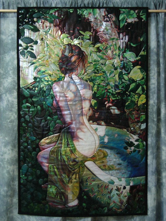The day was hot , the shadows were long . Lindsey getting ready for her bath with nature . Painted image on batik fabric, fused applique , machine embroidery using sulky variegated rayon embroidery thread . |