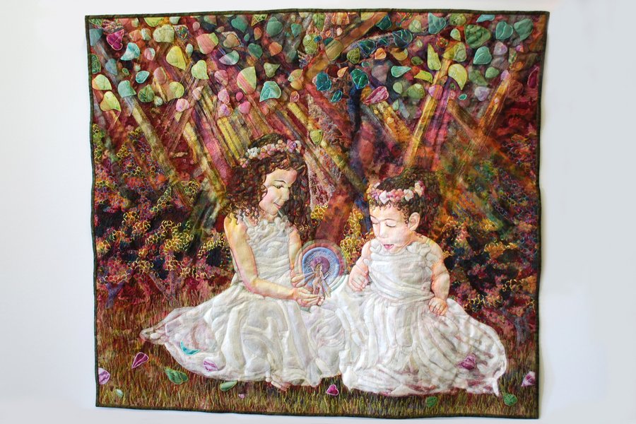 GailEThomas Imagination of Innocence - When we a children our minds our eyes are open to everything . Jade and Jasmine are listening to the lady fairy's story. Batik cotton velvet , painted , fused applique , threadwork