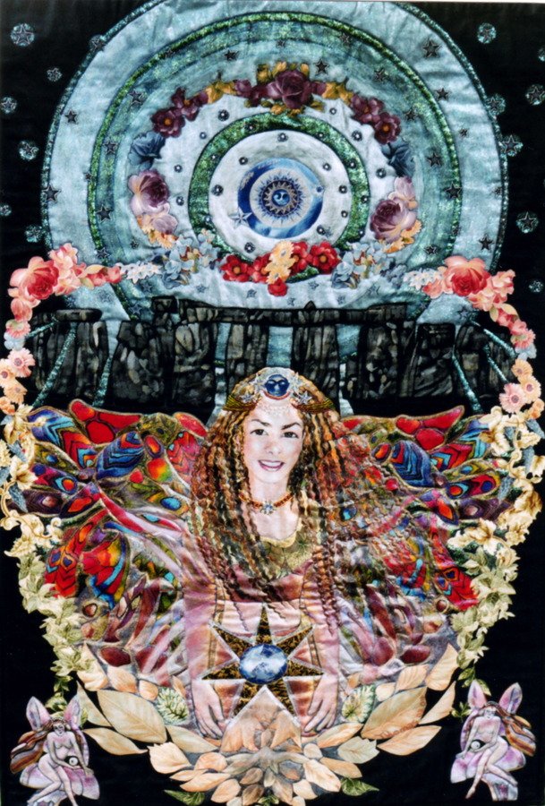 | Design Source - Description | A Fairy Princess in front of Stonehenge on a full moon in spring with the sign of infinity around her and the monument . Painted black cotton , fused applique , and bead work . |