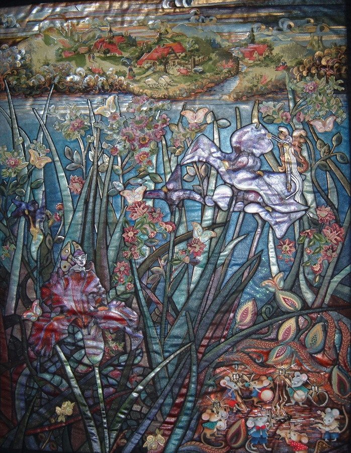 GailEThomas Evening Song - The mice have found an open bit below the Iris to get together and jam . Northcott fabric that is painted and fused applique .