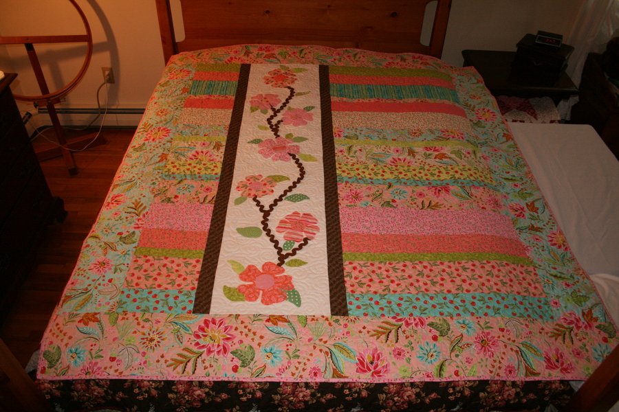retiredgrandma5 Cherry Blossoms - I saw this quilt in a quilt store in Utah while visiting my grandchildren. I loved the big applique flowers. I bought the kit and additional fabrics. The colors are so bright and cheery. I made it for my granddaughter's fourth birthday and hope to make a matching pillowcase.