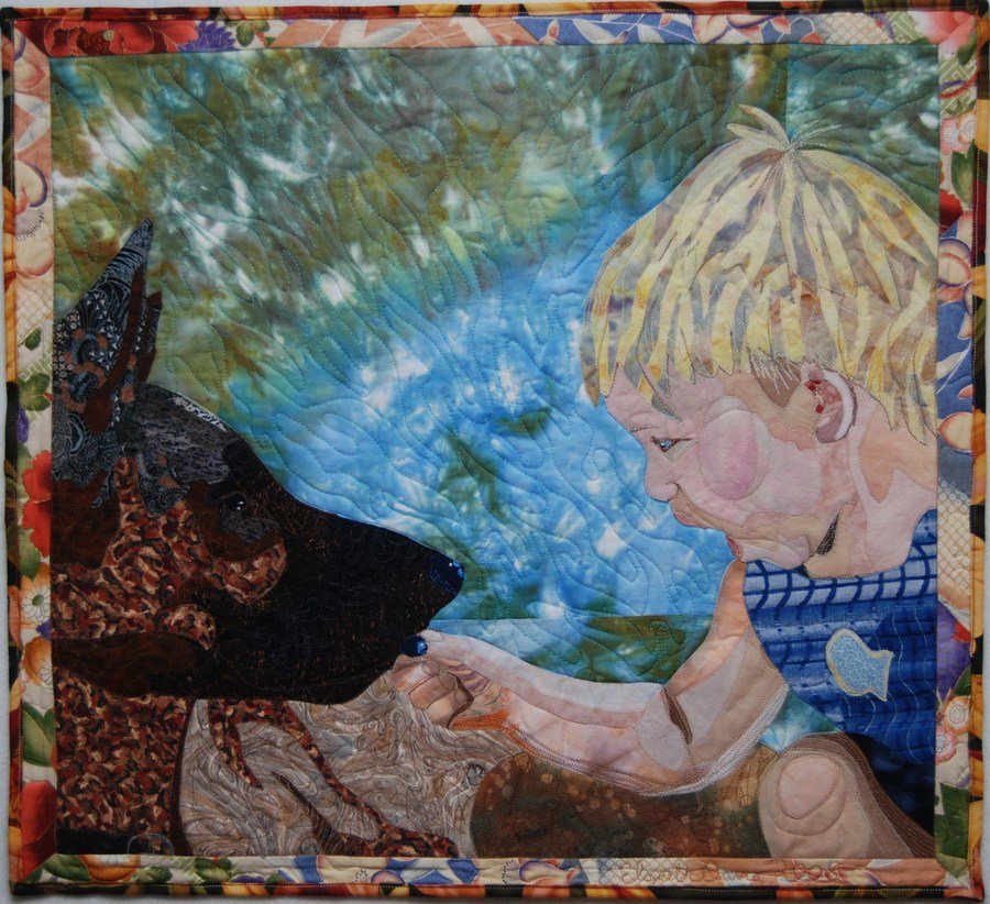 quiltdavis Sharing Blueberries - Machine applique using technique taught by Marilyn Belford in Realistic Fabric Portraits. Photo taken of my grandson and dog both of whom were 18 months old. Steven is sharing his blueberries with Katie the dog.