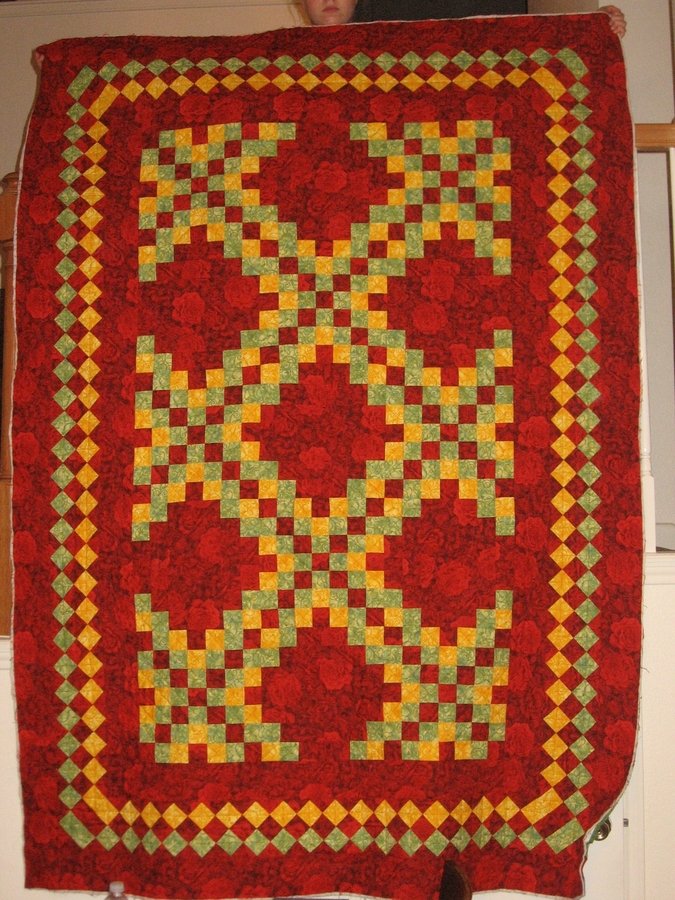 Kellym Maria's Quilt - A triple Irish Chain made with red roses and the chain with yellow, green, and the red rose material.