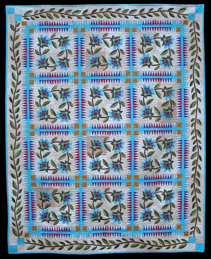 mittelmr Matthew's Favorite! - Made this quilt 'just for nothing' - loved using the bright colors...added more colors, applique pieces, and embroidery, than the original pattern design had. Also was the first time I used paper piecing. Loved using the mixed, printed background. I loved making this quilt!
