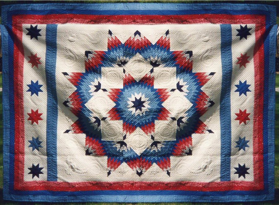mittelmr Matthew's Broken Star - My son always enjoyed my sewing endeavors and this was to be his quilt - we chose the broken star pattern and I added the original 'star' ends. The patriotic color scheme seemed to be a good choice for a boy. This was my first real bed size quilt....and it turned out pretty good. Loved hand quilting it! And he still prizes his quilt, keeping it in very good condition!