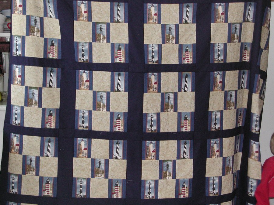 mary3267 Lighthouse - I saw this fabric on eBay and fell in love with it. I wanted to make a masculine quilt, something no flower fabric or patterns. The backing is a faded nautical map pattern. The batting is undyed cotton. I purchased the quilting service off of eBay and she did a great job, using a wave like stich pattern.