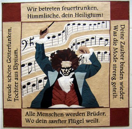 RobinQuilts Title not yet Determined - This quilt will be auctioned off by the Rockford (IL) Symphony Orchestra as part of its 75th anniversary celebration. The words are from the choral movement of Beethoven's 9th Symphony as are the musical notes that appear on the staff lines. I used Melinda Bula's fusing technique for the figure of Beethoven. Each letter was traced on to the fabric; I quilted around each one individually, then colored them in with fabric markers. There is a little bit of subtle thread-painting used to "dress up" the figure, but not so much that it becomes a distraction from the overall impact.