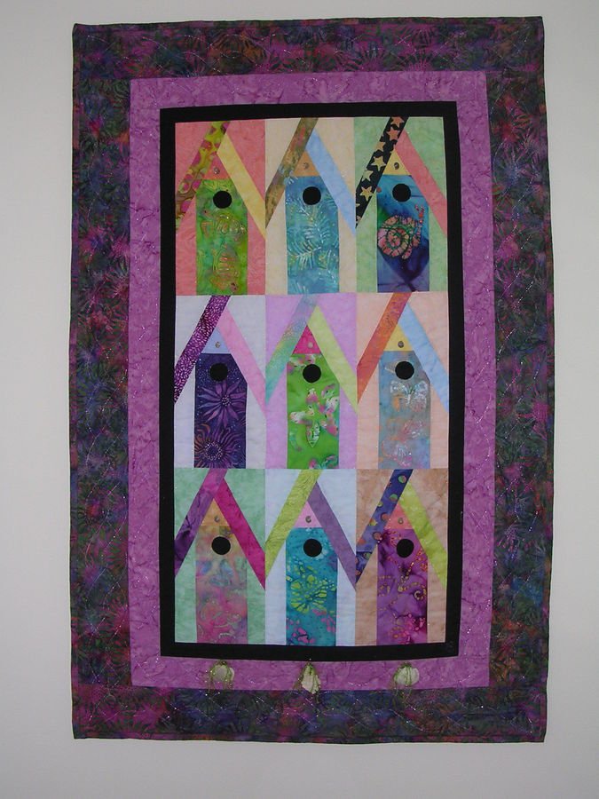 Birdhouses of Key West - I purchased this pattern on my first trip to Key West two years ago. I wanted to make it to commemorate our trip there, so I used batiks in sealife, flower and butterfly patterns. It is machine and hand quilted with purple and gold metallic thread and embellished with beads, Adornaments fibers, shells and coral that followed me home from a wonderful vacation.