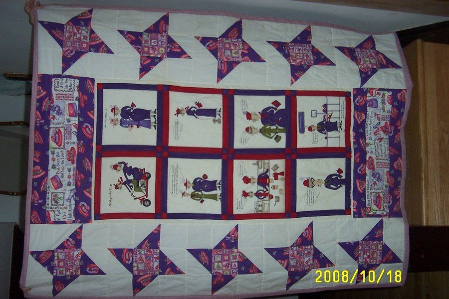 | Design Source - Description | Red Hat Fabric used with the friendship stars. Made for my sister so she would be warm at work as a professor in mn winters. |