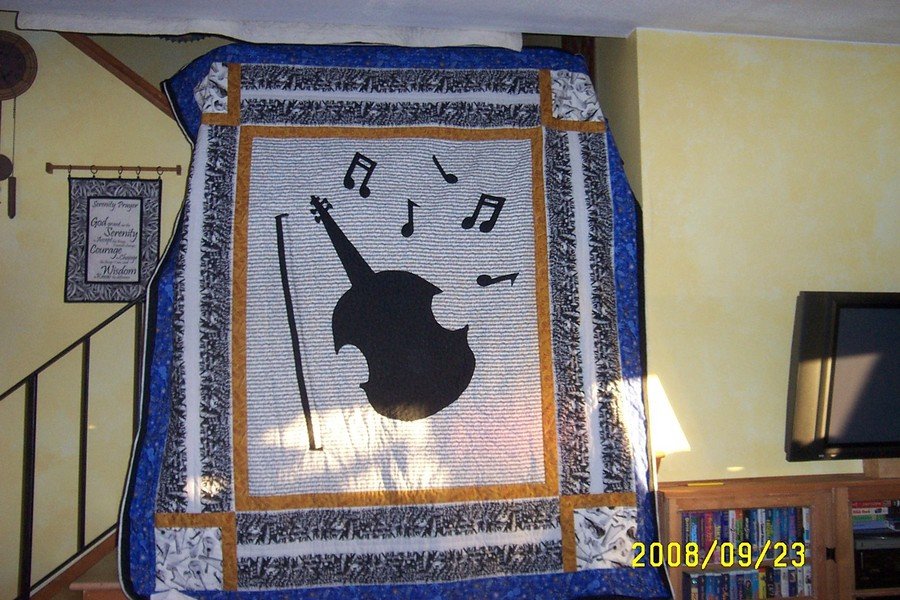 sewwhatwhere Viola - My nephew graduated from college as a music major. His instrument of choice is the Viola. So I shopped for music fabric for a couple of years before making his quilt. I wanted it masculine and reflect my nephew. He loves it!!