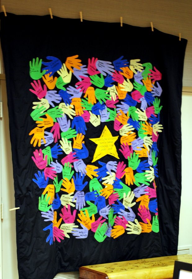 AlohaJo Reaching for the Stars - This quilt was designed and created for our school's Artrageous Art Auction sponsored by the PTA. The quilt has the hands of 144, 6th grade students, each signed by the student, appliqued by machine and the star in the center contains the signatures of our Principal & Assistant Principals. Our school them for this year was Shining Stars. I choose the black fabric with bright colored hands to model the work of some Amish made quilts.