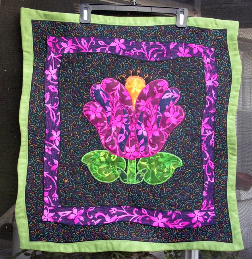 RobJohnson Muana Loa Tulip - This piece was made for a challenge group I belong to. The idea was to learn and use techniques that we would not normally or have not used. It was great fun learning new techniques. My piece includes raw edge applique, wonky borders and faux binding as seen in Ricky Tim's Caveman video, and lastly FMQ, which I still need a lot of practice with.