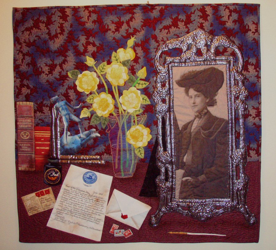 PatHobbs Lillie Ellizabeth Adler - This quilt honors my great aunt and is one of a series that I have made about my ancestors. It was also completed for the 2009 Bishop Hill challenge. Bishop Hill, Illinois was originally settled by Jansen Swedes. The first flower planted was the yellow rose called "New Providence," and it is still growing there today. The challenge stipulated that the yellow rose must be featured on the quilt and made from a bright yellow fabric. As my Great Aunt Lillie lived in Sweden around the time of Bishop hill's 60th anniversary, the theme of the quilt is designed around this fictitious celebration. Lillie was a good friend to Carl Milles, the sculptor, so the bookend image is one of his sculptures. The book on the far left of the desk contains my great grandfather's biography. The decor is typical of that era and owing to the darkness of the background, the roses seem to stand out. The desktop vignette does offer up a few clues as to my Great Aunt's identity.