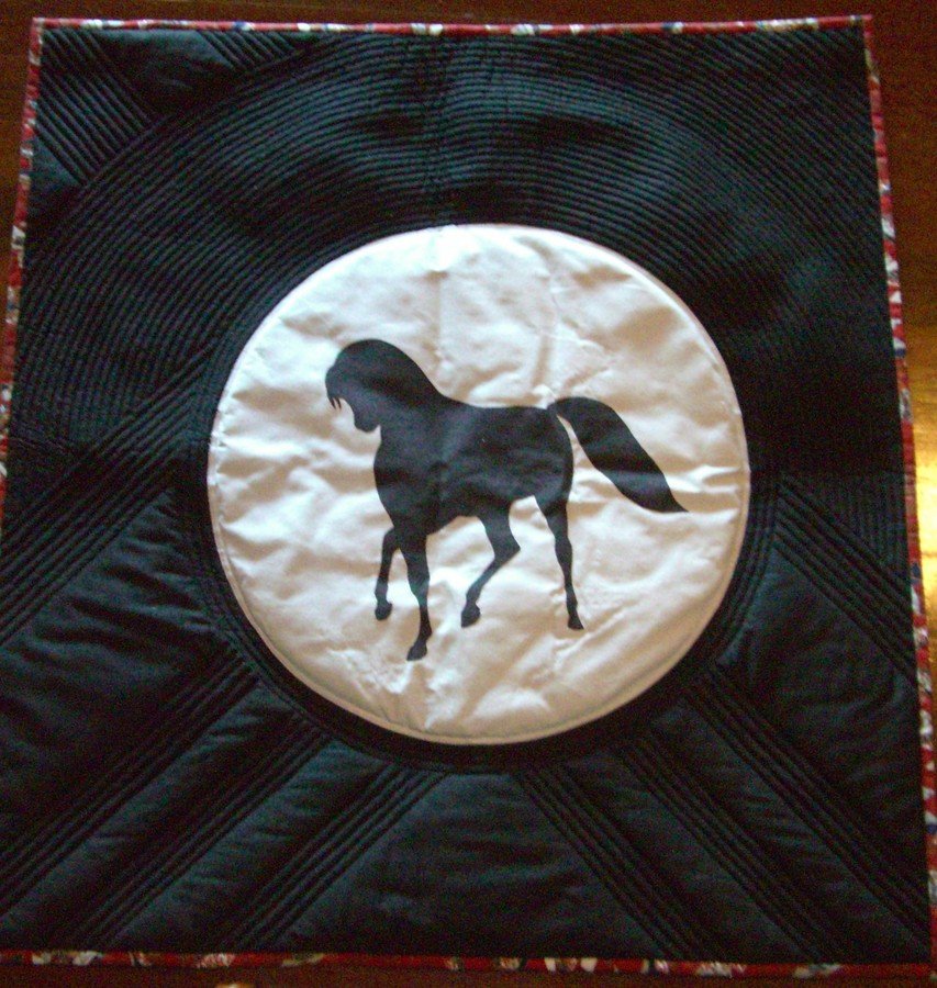| Design Source - Description | I dreampt this one night & started on it the next day. All cotton Horse is irioned on fusing & all quilting is done by machine. Still have not found the right person to give it to???? |