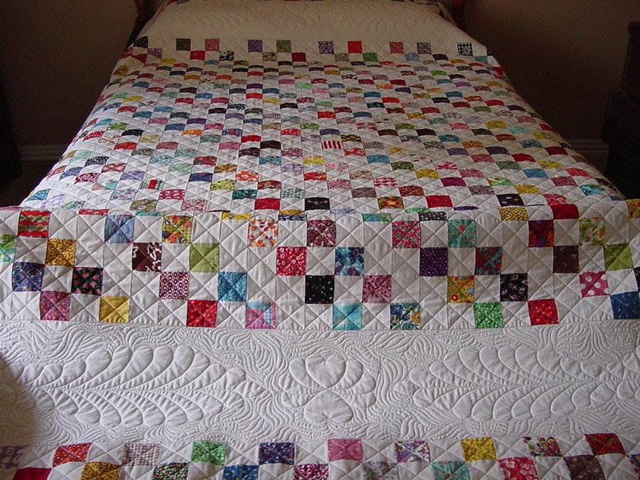 FromRagsToStitches A Square Deal - Barbara couldn't stand to let these 2" blocks go to waste! A friend's mother spent many, many hours fussy cutting blocks out of old clothes & Barbara wanted to honor her by creating an original quilt in her memory.