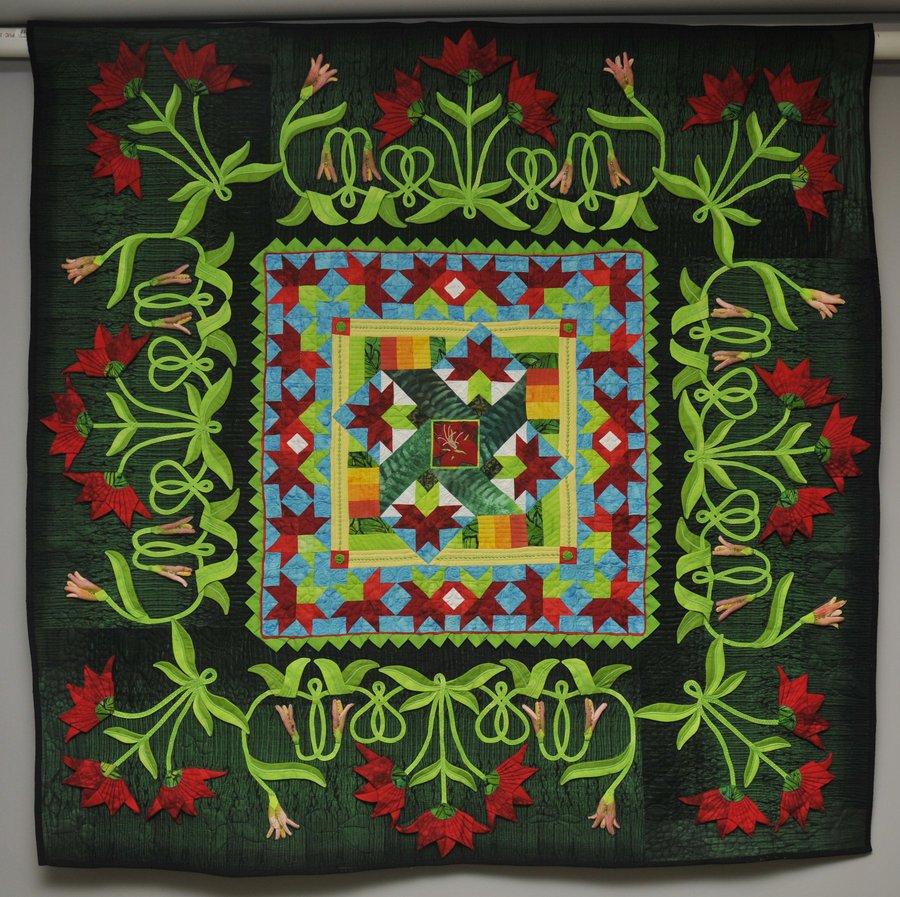 | Design Source - Description | Crazy quilt commemorating my twenty fifth wedding anniversary. The back is in the pattern of fans with various lace borders. The edge is a burgundy ruffle sandwiched with 20 yards of antique lace. |