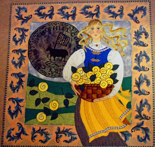 PatHobbs Ny Providencegulingblomma (Yellow Rose) - The quilt incorporates the yellow rose and seal of Bishop Hill, IL as well as the Swedish maiden in traditional dress and a handpainted Kurbits style border (completed for the 2007 Bishop Hill challenge).
