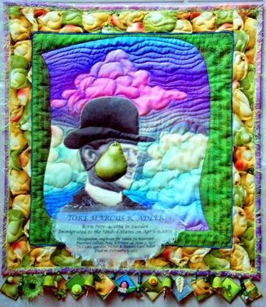 PatHobbs The Unknown Swedish Immigrant - The Unknown Swedish Immigrant is based on the works of Rene Magritte, but the image is my grandfather. A computer printed scrim of batiste lists my grandfather's "stats." The bottom edge of the quilt has a fringe made of inchies, beads and hand dyed silk cocoons.