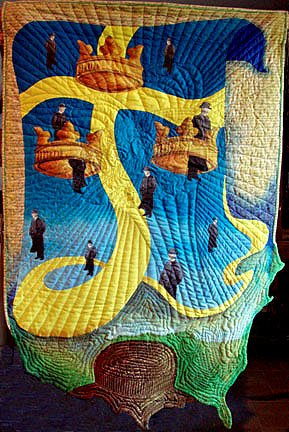 PatHobbs Tore's Journey after Rene Magrite - After finding a photo of my grandfather in a "bowler" hat, I decided to make this quilt in the style of the artist Rene Magrite. My grandfather floats down over the surface of the Swedish flag into the United States. The crowns (tre kroner) represent Sweden, Norway, and Denmark or the three countries that came together in a peace pact. The yellow cross of the Swedish flag becomes the path for Tore, my grandfather.