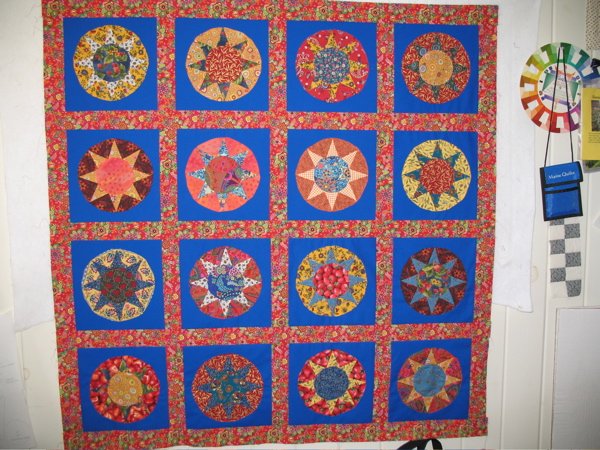 Chickadee24 Juicy - After taking a class from Judy Mathieson at Maine Quilts 2006, I bought her books Mariner's Compass Quilts. This star block is a very simple variation of the Mariner's Compass. I used many strawberry fabrics, hence the title "Juicy".