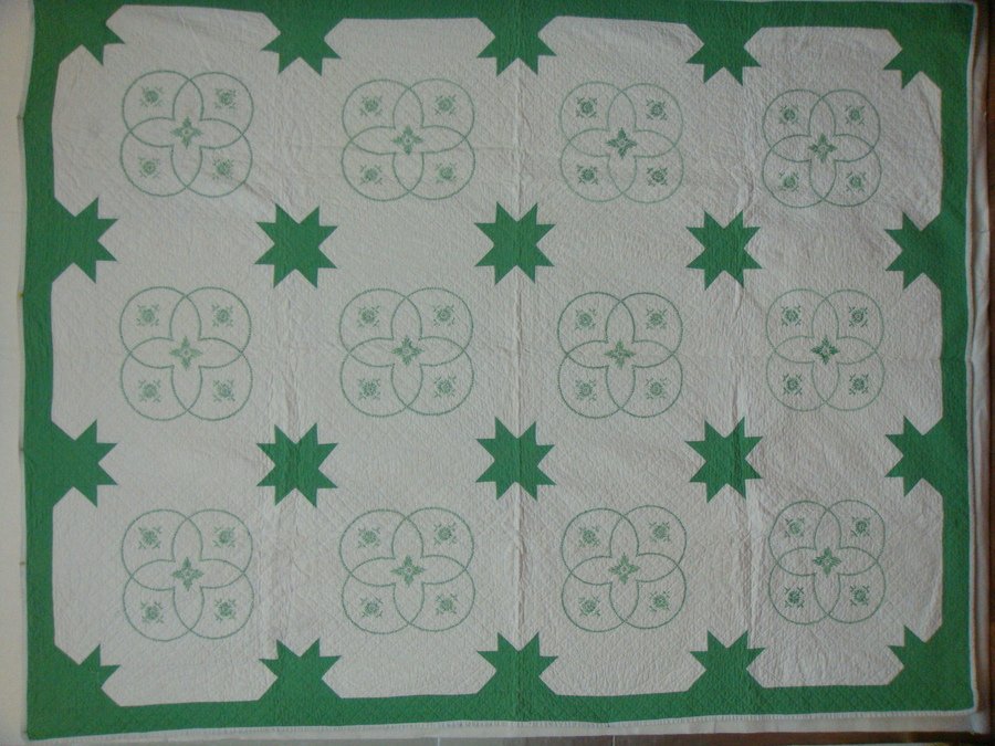 MCapps1999 Antique Green & White Cross-stitch & Pieced Quilt - This is the better of two quilts made in the same pattern! I have a b/w photo of these on double beds in my parents master bedroom. These were obviously hand made as there are matching "issues" in the pieced border of both. All cross stitch and embroidery were hand done with embroidery floss. The green appears to be the "40's green", but I am uncertain when these were made and by who. Unfortunately, anyone that I could ask has passed away. While I listed this as a traditional pattern, I am not sure as I haven't seen anything like these two. This one that is pictured is in the best condition with only a very small, light stain. Its twin has several small stains that are darker. Bindings show slight wear. Otherwise, both quilts are in tip top condition.