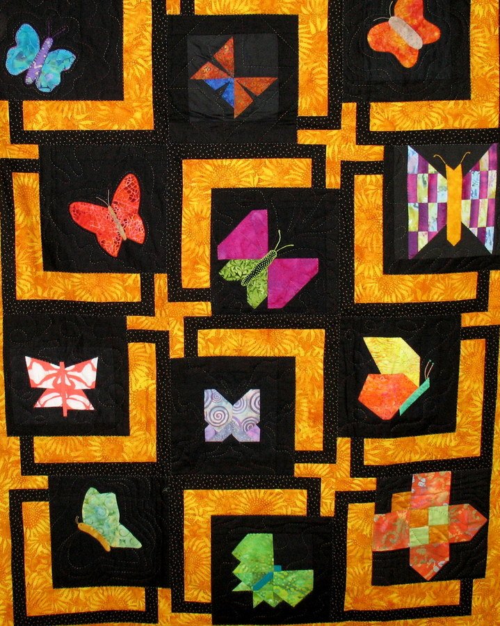 marbles Free to Fly - This was a "Baker's Dozen" block exchange with a subgroup of my Guild. We each make 13 blocks, keep one and exchange the rest. The challenge was for batik butterflies on an amish black background. I used King Tut variegated thread to handquilt, and while it doesn't show well in the photo, looks beautiful on the amish black fabric.