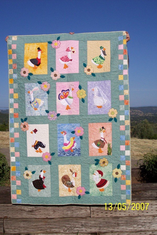 kathy2 Goosy Goosy Gander - We have a small group of appliquer's and this was a block of the month. I created this quilt all the way and practiced macine quilting on it. I rather like it.