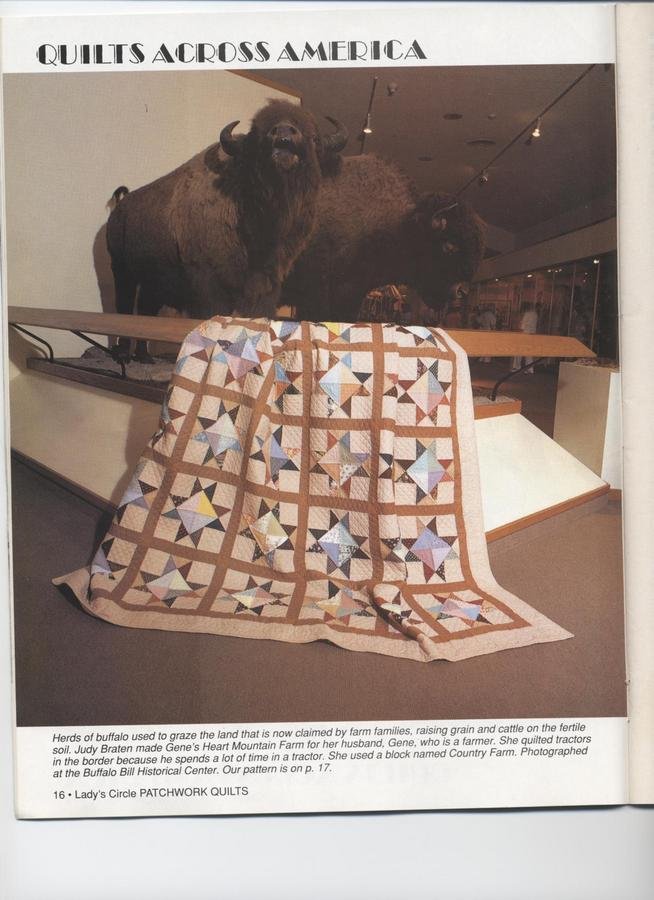 HappyQuilterWyo Gene's Heart Mountain Farm - This is the first machine pieced quilt I made -- I thought the blocks were quite ugly but my husband just loved them so I decided to quilt it up for him. He's a farmer, country farm blocks, so I quilted tractors in the border as he spends lots of time in the tractor.