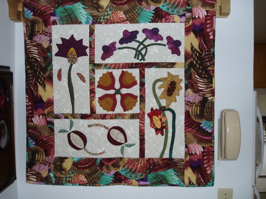 HappyQuilterWyo Funky Flowers - Several of us decided to learn to applique so we used an applique book and made several of the little quilts in the book. This is my favorite one.