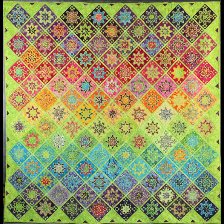 marilynrsmithquilts Joy - This is an adaptation of Karen K. Stone's quilt pattern, Dilerious, in her book, Karen K. Stone Quilts. There are 114 different fabrics in this quilt and each block is different. This quilt was constructed by a quilt as you go method. It won first in applique quilts at AQS Paducah in 2008 and Honorable Mention in Innovation Large Applique at 2008 Houston Quilt Show. It appeared on the 2009 AQS Wall Calendar and will appear on the 2010 IQA Wall Calendar. It was on the cover of the November 2008 QNMagazine. It has been such a joy to me......no pun intended.