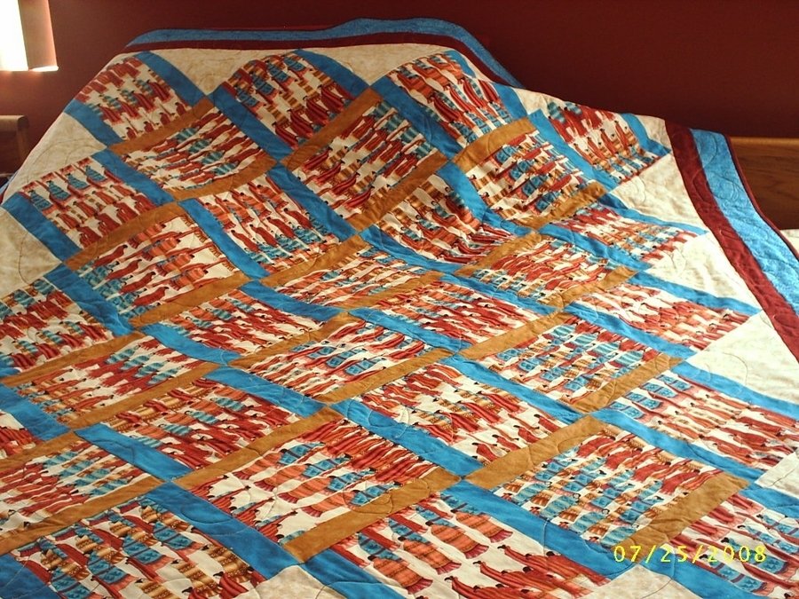 StitchinRN AZ Remembered - I took a Stack-n-Whack class. This is the result. I love the technique and can't wait to try a different patten in the book. The fabric and colors are southwest. The colors are so dramatic and bright. This quilt is living on my quest bed. The back of this quilt is pieced as well, simply because I had enough fabric left over. I cannot add a picture of the back of the quilt in this description. But it is nice to have a reversible quilt.