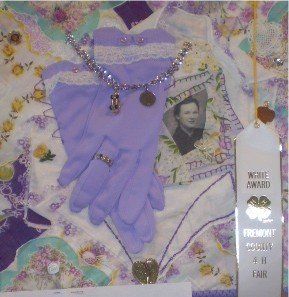 GrannyKat Lorine Loves Lavendar - This hanky panky quilt was designed in honor of my Mother-in-Law, Lorine Lautaret. I learned in a class how to print photos on fabric. I took Cindy Brick's Hanky Panky Handkerchief class and designed this quilt using Lorine's hankies, gloves, jewelry, charms, and favorite color.