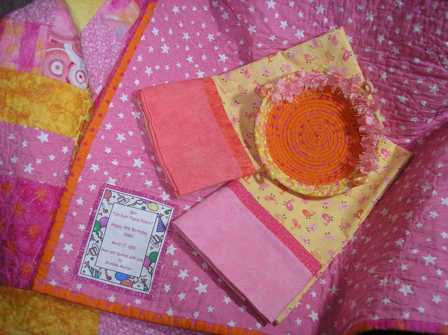 | Design Source - Description | Pillowcases and fabric bowl made from the scraps of Nikki's quilt "Tutti Frutti Tropical Patootie". A quilt isn't finished unless you accessorize it. I would have made a bed ruffle but she has a bunk bed. |