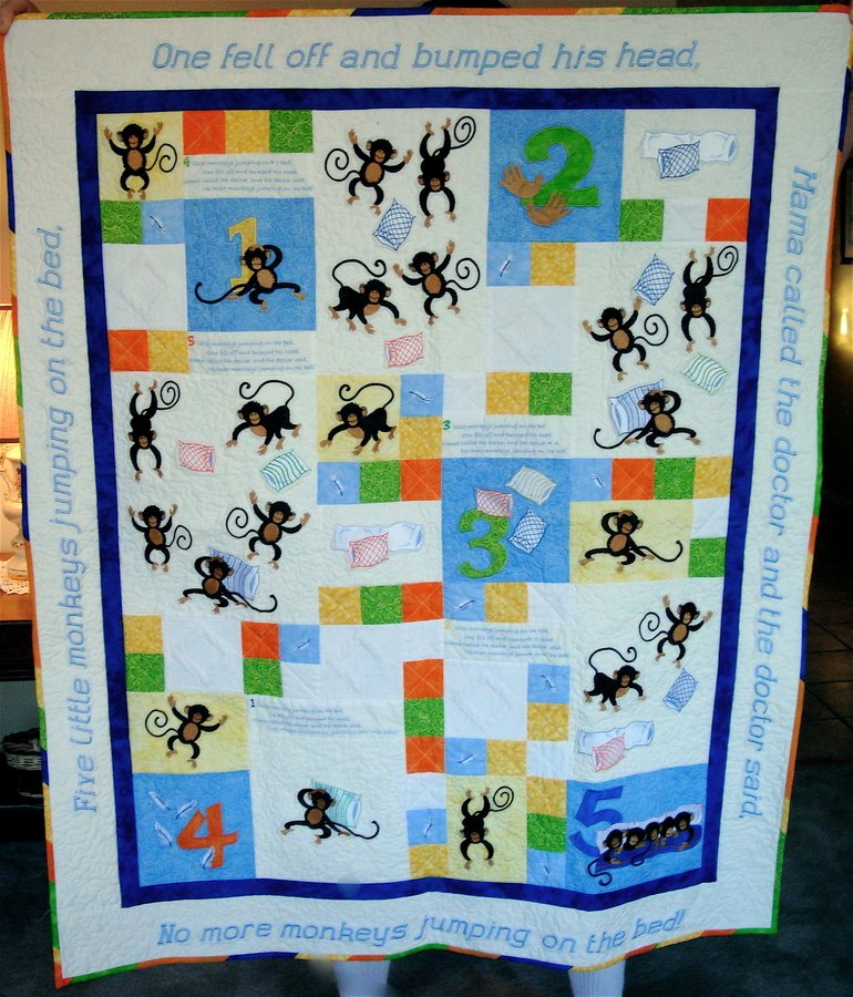 stephiepeterson Five Little Monkeys - This quilt was so fun to make. It represents a lot of firsts for me: (a) first quilt I did embroidery on, (b) first quilt I quilted myself (much of it on my friend's long arm machine), (c) first quilt I used a quilted embroidery design for some of the patches, (d) first quilt I embroidered the quilt label on, (e) first scrappy binding, and (f) first quilt where I did everything, from start to finish. This was a ton of fun to make, and I learned so much about embroidery on this quilt. Had done some embroidery before, but not like this. The monkey embroidery designs were purchased from oregonpatchworks.com. The design set is called Monkey Shines. My stipple quilting for the blank blocks was embroidery designs purchased from myfairladydesigns.com. This is going to be a baby gift for my dear colleague, Dr. Jeong-il Cho. It will be a hard one to give up!