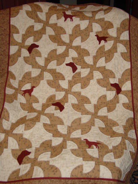 quiltnut851 Irish Setters Rule - Made my own drunker's path design with all dog print material. I appliqued Irish Setter heads and bodies to the top....especially for my husband who shows our Irish Setters in Obedience trials around the country. He has had the top Irish Setter in obedience in the country the last few years.