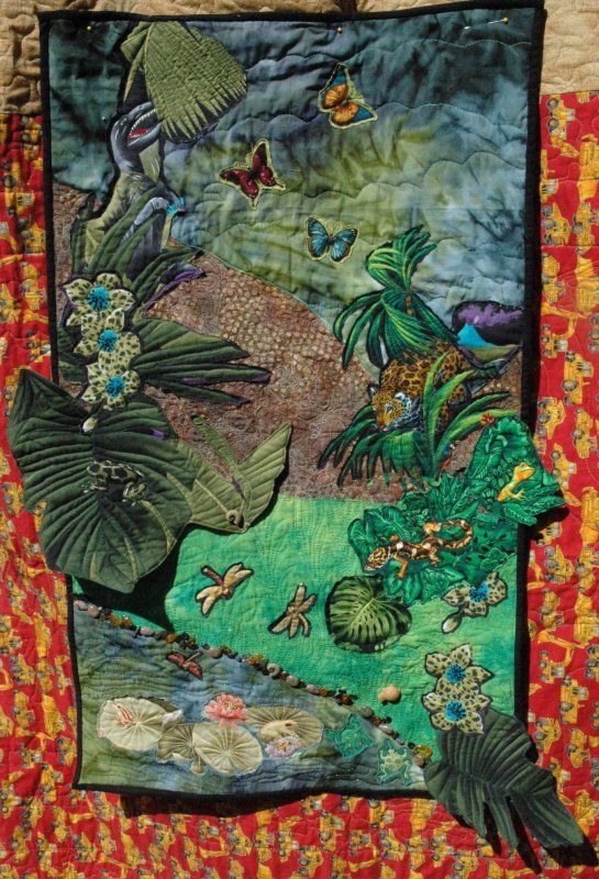 | Design Source - Description | Joshua, my grandson, aged 5, loves frogs. This collage quilt, begun in a class taught by Susan Vassallo, features frogs hidden under 3-D leaves and lots of embellishments. |