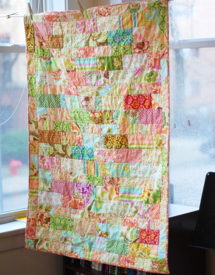 sewshaz Rainy Day Reading Quilt - Amy's pattern is available free on her website. I used two different size of rectangles and added a border on the long edges. I stitched in the ditch for the quilting, though, being new and not knowing any better. I started from the middle and went out, following the offset seams, to the edges. I like how it came out, but I think I'd do it a little differently next time.