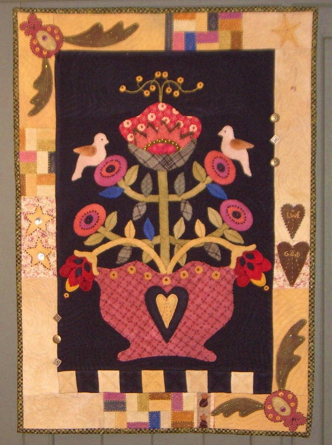 | Design Source - Description | I wandered into the world of wool and fell in love with it's rich texture. It's a joy to work with. I designed this quilt because I love folk art and Jacobean style quilts and enjoyed every minute of it. |