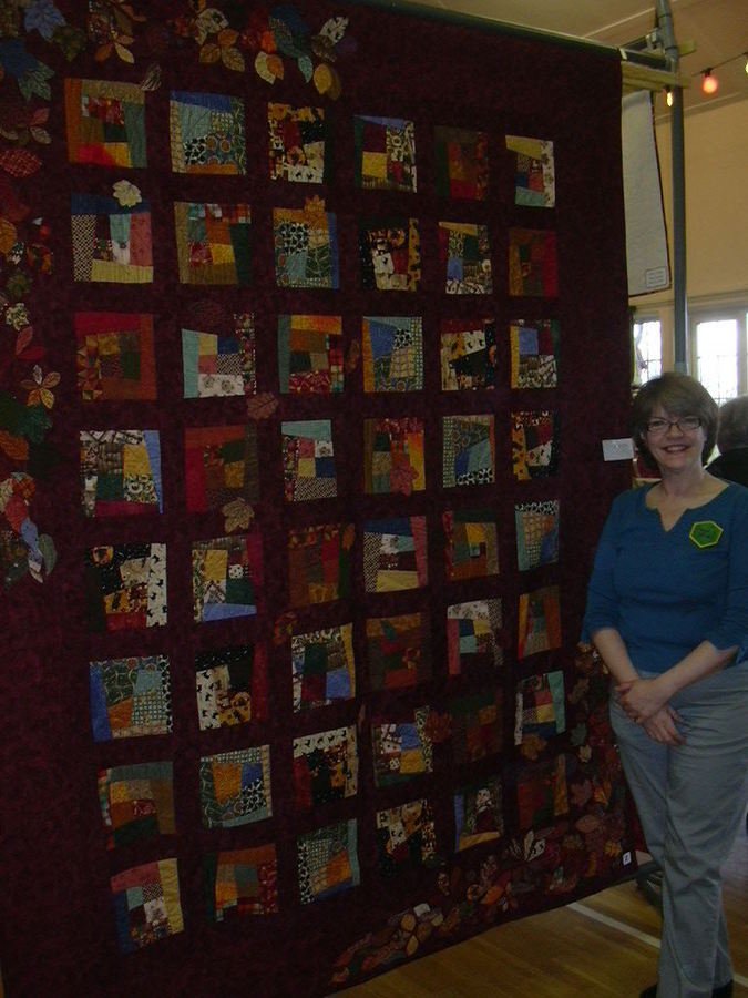 Yjenn Autumn's Progress - Original technique used 6 fabrics. I added 2 more and a further cut to make my version. Meant to depict all of Autumns changing moods,colours and holidays. Hand appliqued leaves and machine quilting.