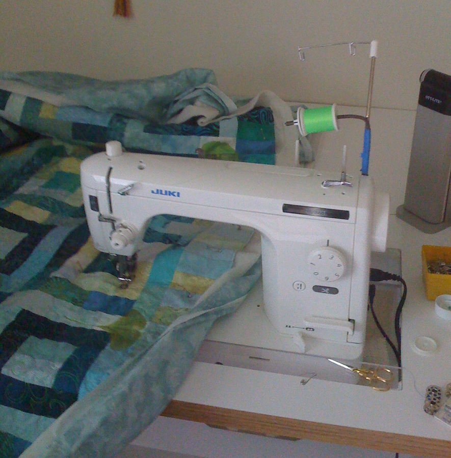 defling bedroom quilt - The quilt is king sized, so you only see a portion of it, but I wanted to show how I adapted my Juki thread delivery system to accomodate stacked wound spools.