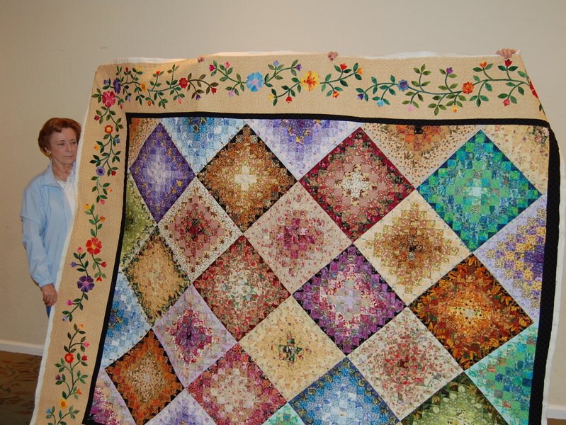 My Dream Quilt - Got instructions for this quilt from a friend who had taken a class at a quilt shop. She was told the pattern hadn't been published and I've never seen it anywhere. The technique is similar to mirror image bargello, only in individual blocks. Each set of 8 coordinated fabrics makes two blocks, a light center and a dark center. It takes lots of shopping to find 8 coordinated fabrics ranging from very light to very dark in 12 different colors. But who's complaining about fabric shopping? I designed the hand appliqued border using three simple flower shapes and lots of colors, just like in the quilt center.