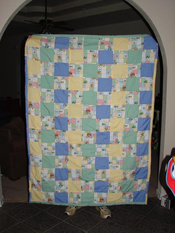 Front- Teddy Bear print, yellow gingam, blue & green 5"sq. Back- made from husband's shirts, baby blue sq. & white 10" square's. Made for grandson. My first completed quilt. |