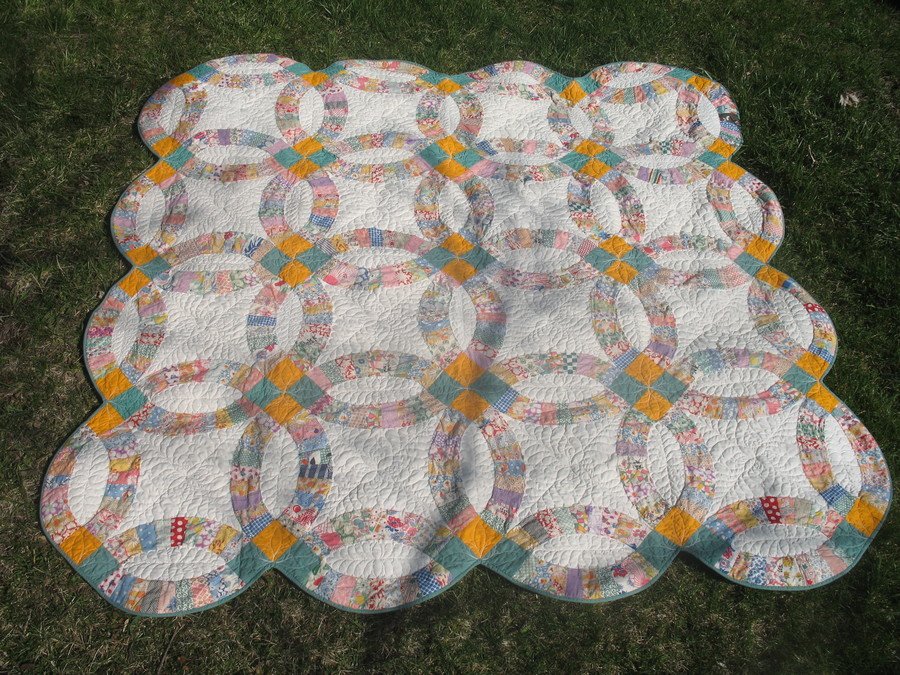 Bridget473 Great-Grandmother's Double Wedding Ring - My great-grandmother hand-pieced the arcs using feed sacks many years ago but she never completed the quilt. My grandmother had the pieces in a trunk and passed them down to me to finish. I had to draft several templates for all the white pieces but they finally fit and I was happily able to finish the quilt.
