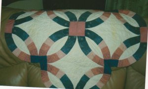 wyquiltr "Double Wedding Ring" - I took a class at "The Quilted Apple" in Phoenix AZ from Laurene Siminea. She owned the Quilt Store. The pattern is by Mary Ellen Hopkins. Laurene has sinced passed away from cancer -- but her store is still open. (Unfortunately this quilt has two stains from the quilt rack I had it displayed on. I don't know if they will come out or not.)